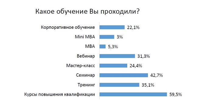 При этом чаще всего респонденты выбирают курсы повышения квалификации (их прошли 59,5% опрошенных), семинары (42,7%) и тренинги (35,1%).